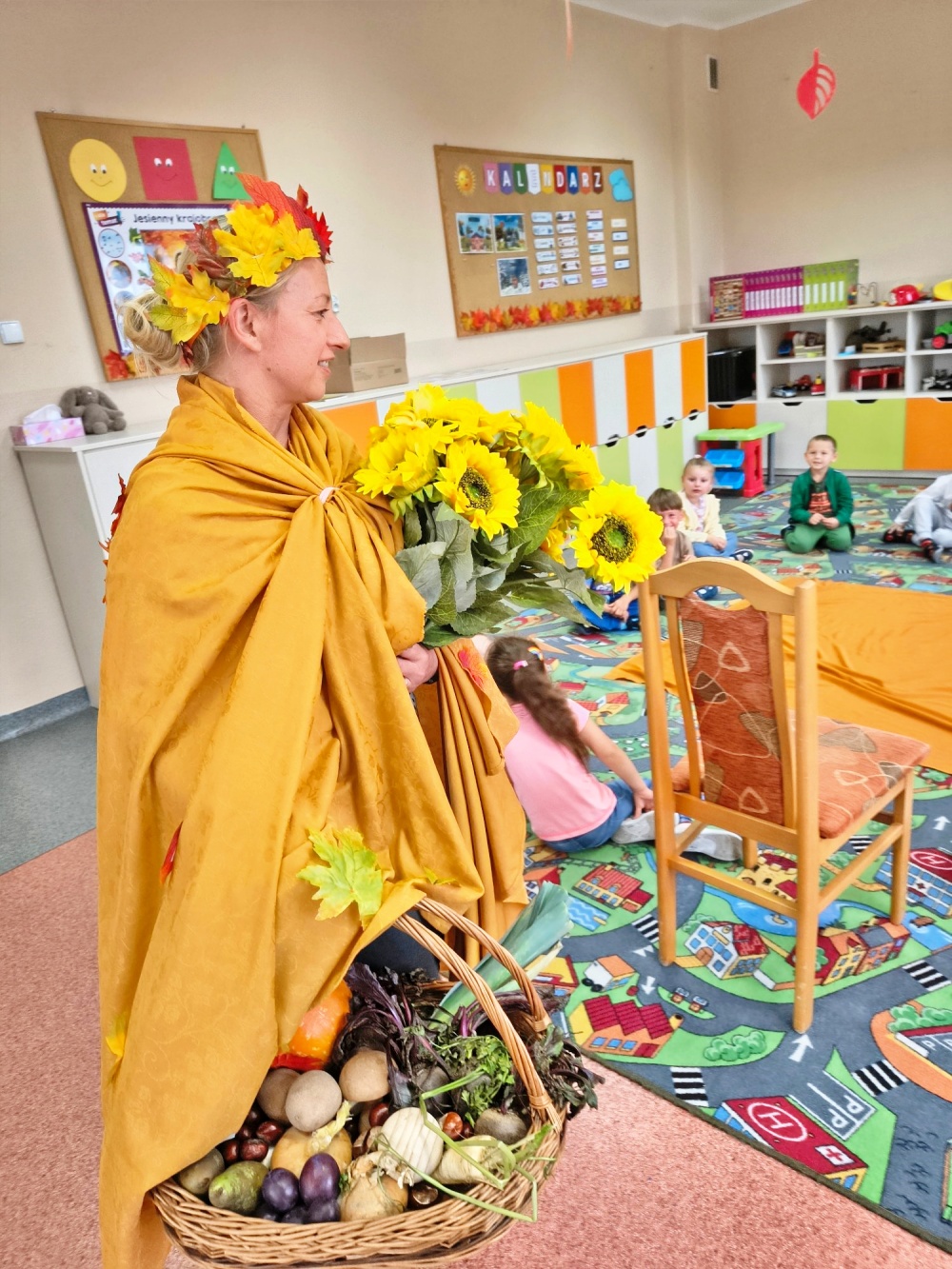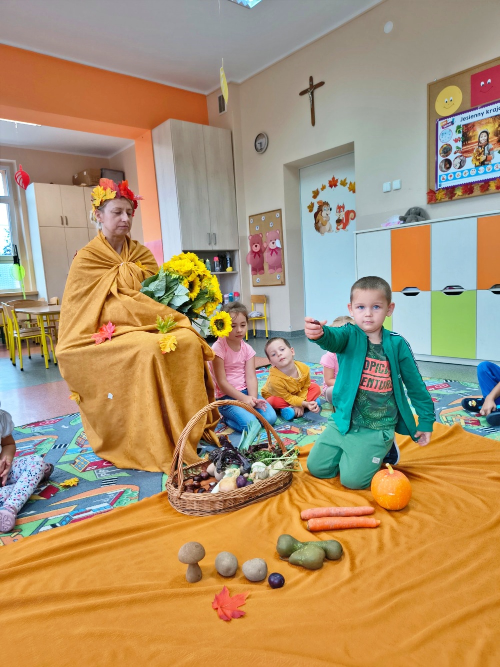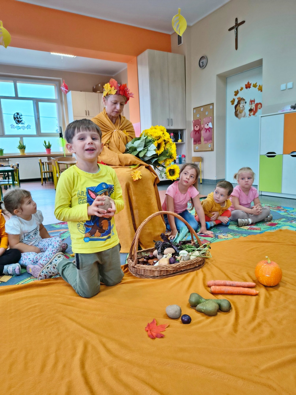 Tego dnia odwiedziła nas niezwykła gościni- Pani Jesień, która przyniosła ze sobą kosz pełen darów jesieni- kolorowe liście, kasztany, żołędzie, szyszki, gruszki, jabłka i warzywa. Dzieci z wielką radością odkrywały, co kryje się w jesiennym koszu, rozpoznawały różne skarby i dzieliły się swoimi obserwacjami.