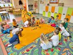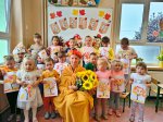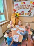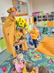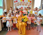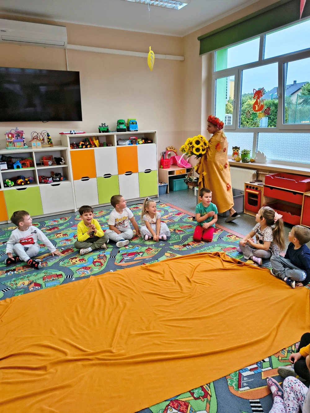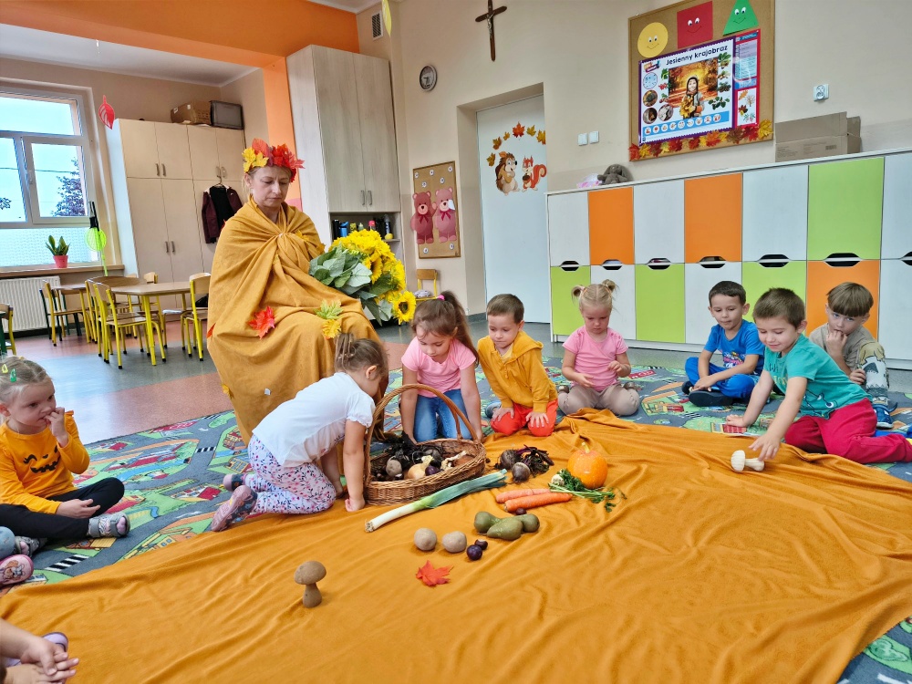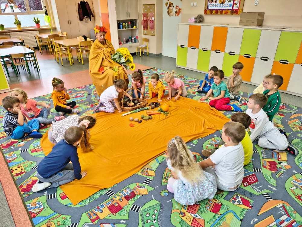 Tego dnia odwiedziła nas niezwykła gościni- Pani Jesień, która przyniosła ze sobą kosz pełen darów jesieni- kolorowe liście, kasztany, żołędzie, szyszki, gruszki, jabłka i warzywa. Dzieci z wielką radością odkrywały, co kryje się w jesiennym koszu, rozpoznawały różne skarby i dzieliły się swoimi obserwacjami.