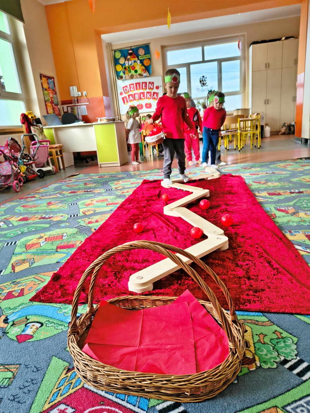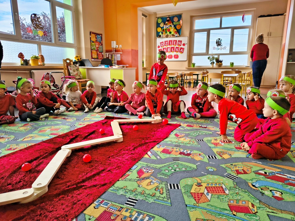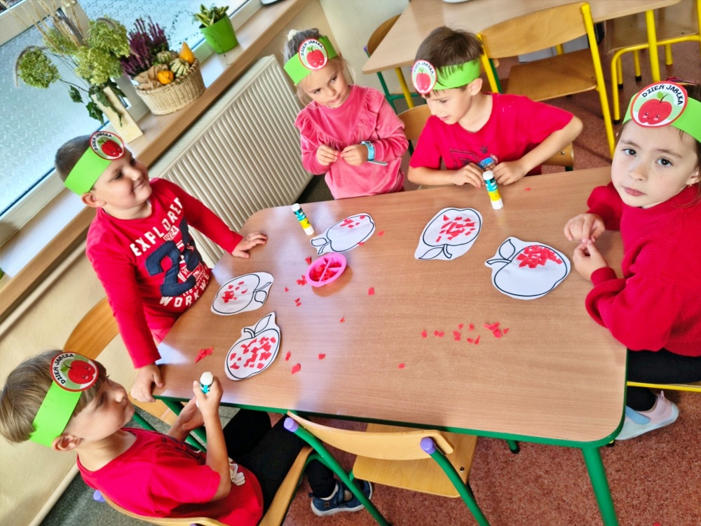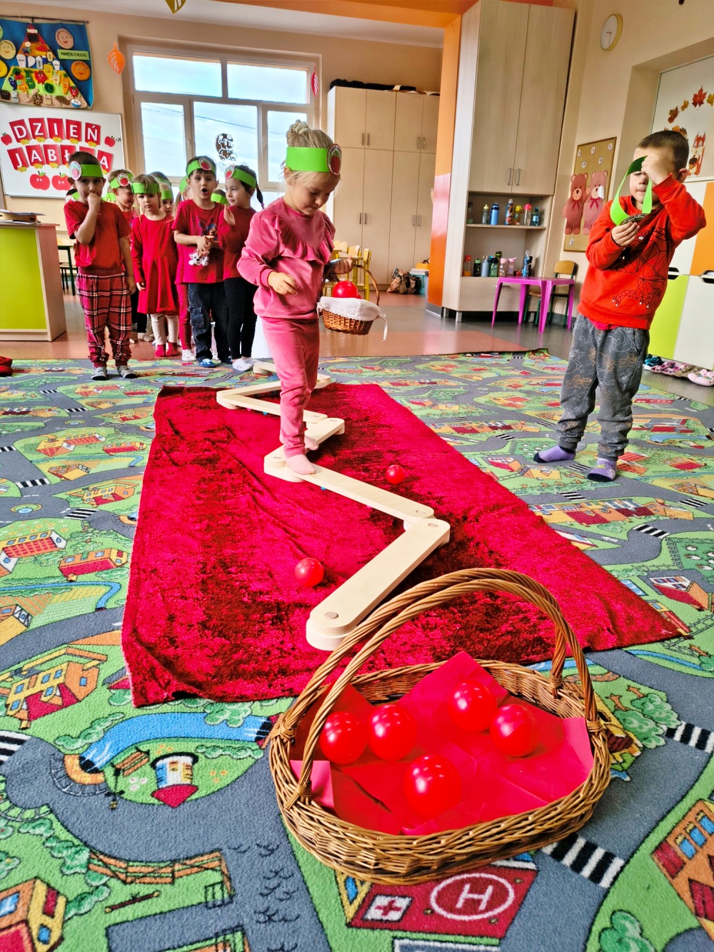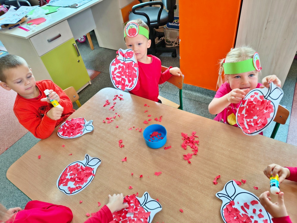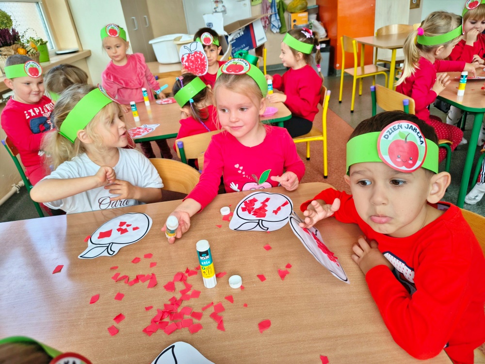 Na przedszkolaków czekało mnóstwo atrakcji. Dzieci z radością pokonywały specjalnie przygotowany tor przeszkód, który wymagał zwinności i sprytu. W ramach zajęć plastycznych powstały piękne, kolorowe prace – jabłka wyklejane.