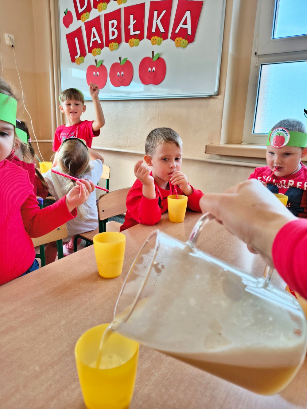 Największą frajdą było wspólne przygotowywanie świeżo wyciskanego soku z jabłek, który smakował wyśmienicie i dał wszystkim zastrzyk witamin! Nie zabrakło też śpiewu – dzieci z entuzjazmem prezentowały piosenki o jabłku, ucząc się przy tym nowych słów i rytmów.