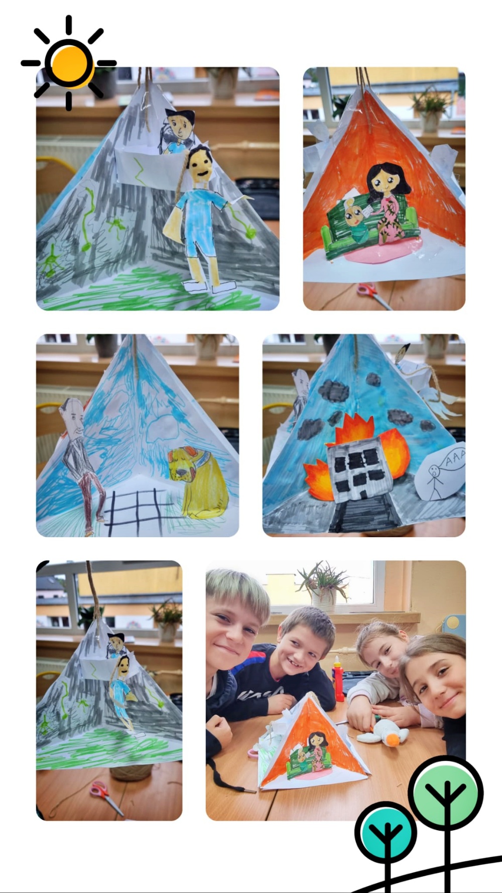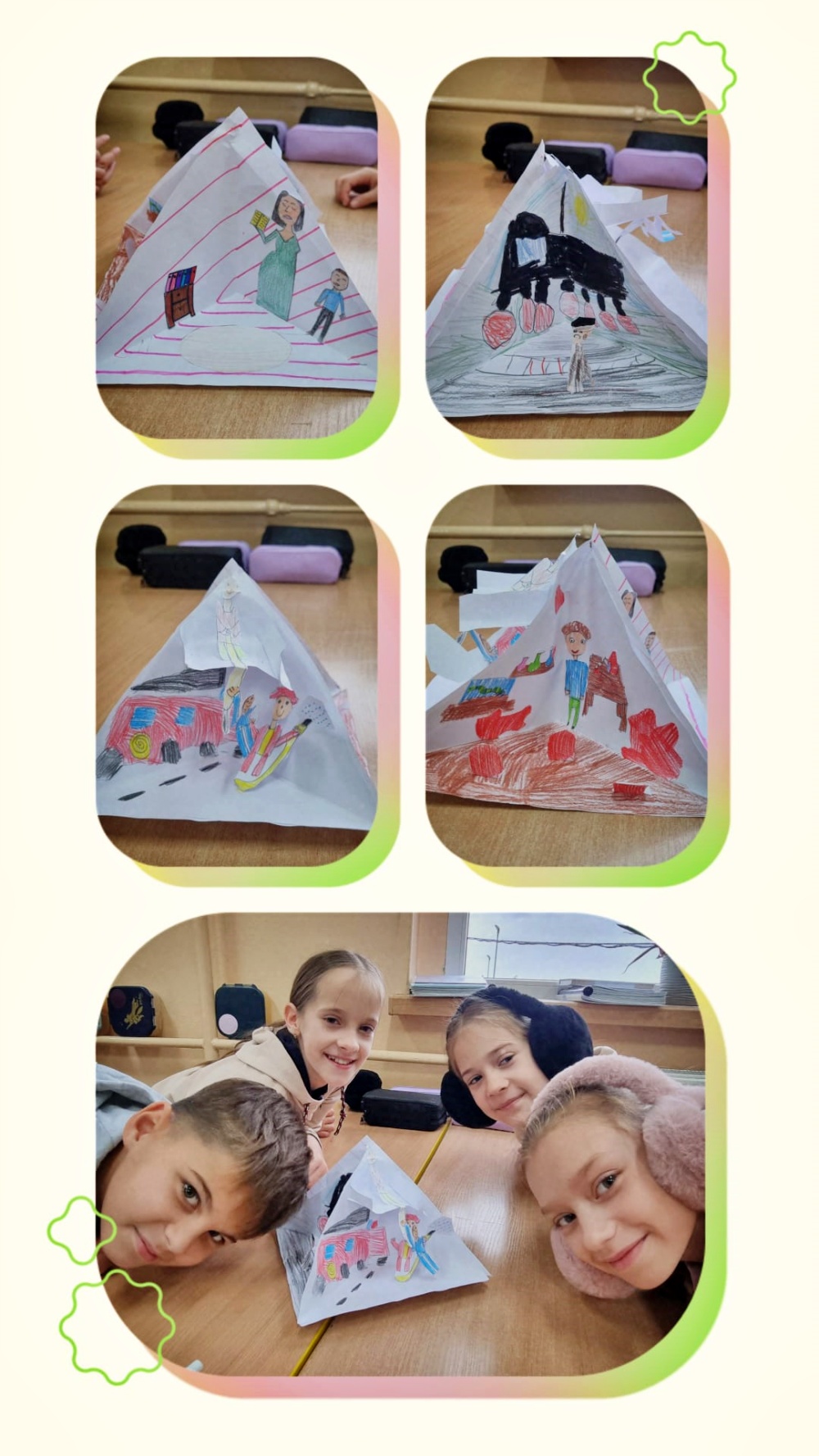 Metoda ta, zwana trioramą, jest przestrzenną formą plastyczną, przypominającą ostrosłup. Dzieci pracowały w grupach, wspólnie dokonały podziału, kto zajmuje się przedstawieniem wybranej sceny z życia Juliana Tuwima, a następnie tworzyły oryginalną pracę zbiorową. Aktywizująca triorama bardzo się dzieciom spodobała i dodatkowo pokazała, jak zgranym i sympatycznym zespołem jesteśmy.