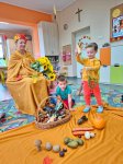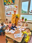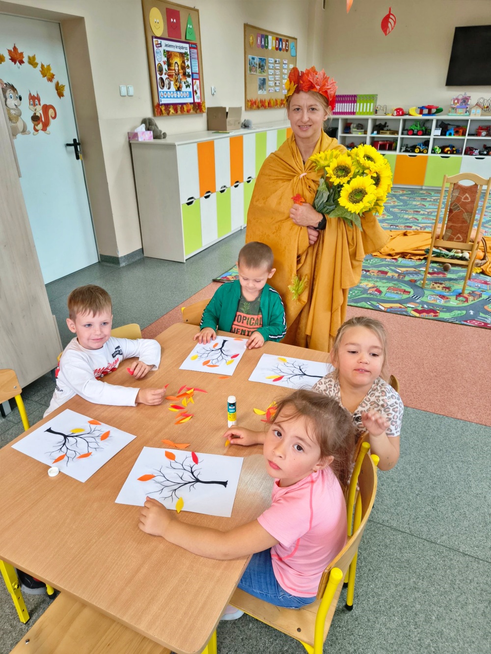Tego dnia odwiedziła nas niezwykła gościni- Pani Jesień, która przyniosła ze sobą kosz pełen darów jesieni- kolorowe liście, kasztany, żołędzie, szyszki, gruszki, jabłka i warzywa. Dzieci z wielką radością odkrywały, co kryje się w jesiennym koszu, rozpoznawały różne skarby i dzieliły się swoimi obserwacjami.