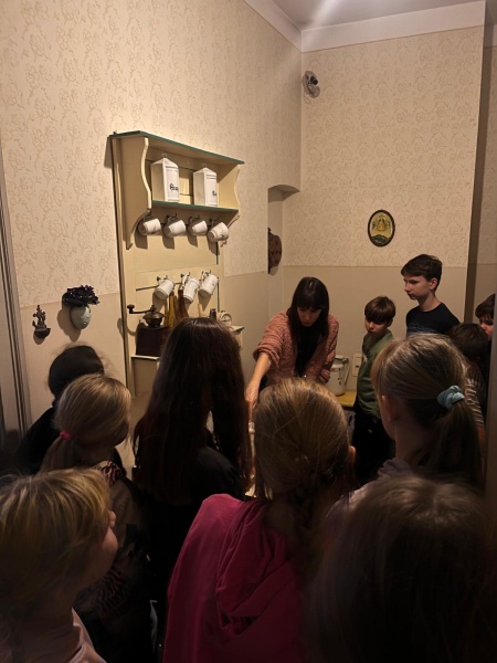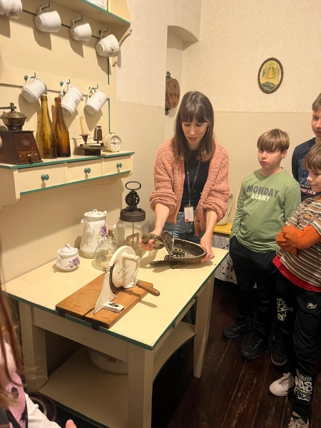 Drugim przystankiem była Kamienica Czynszowa, która w swojej autentycznej formie ukazuje życie codzienne w XIX i XX wieku. Wnętrza zaaranżowane w stylu epok, od skromnych pomieszczeń robotniczych po bogatsze mieszkania, pozwoliły uczniom poczuć atmosferę dawnych czasów. Zwiedzanie było doskonałą okazją do zadawania pytań o realia życia codziennego naszych przodków, co zachęciło do dalszego zgłębiania historii społecznej.