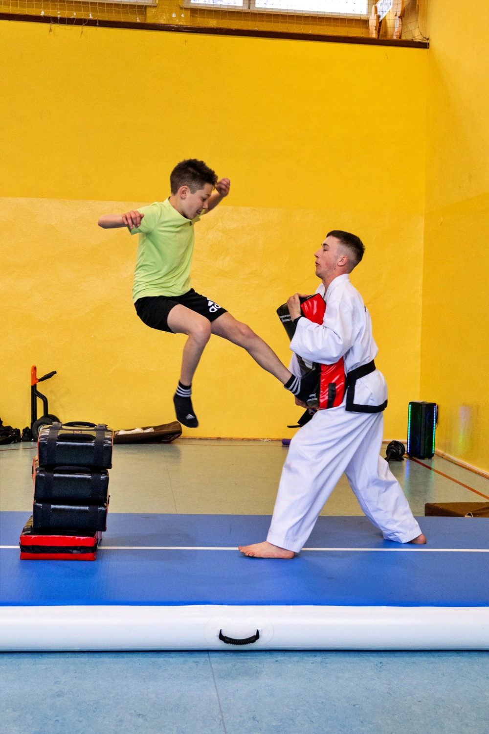 Podczas spotkania dzieci mogły nie tylko poznać podstawowe techniki taekwondo, ale też dowiedzieć się, czym jest ten koreański sport walki, jak wpływa na rozwój fizyczny i psychiczny oraz jak ważne są samodyscyplina, szacunek i wytrwałość. Trener Bartosz w ciekawy sposób opowiadał o swojej przygodzie ze sportem i zachęcał do aktywności fizycznej.