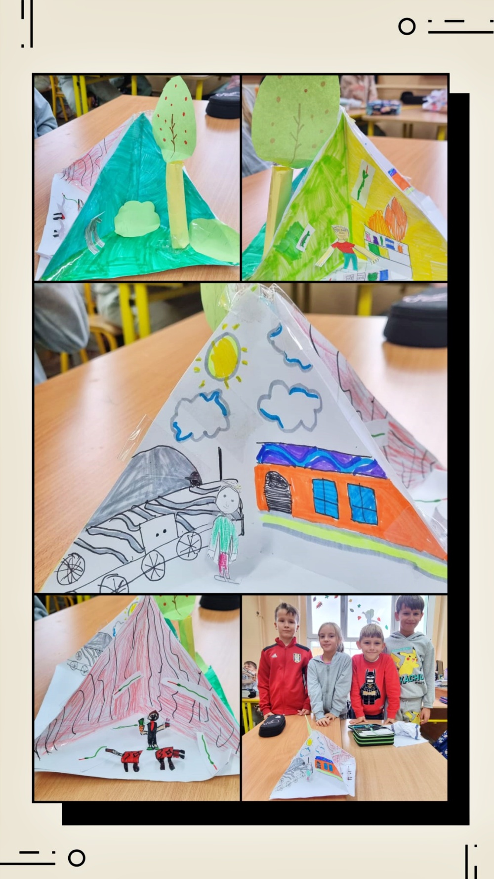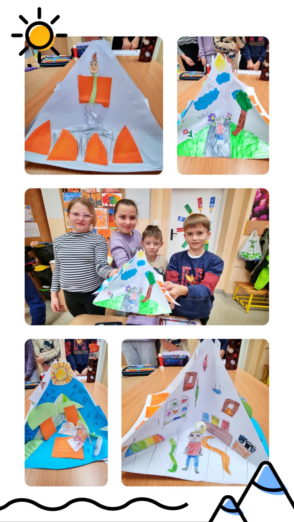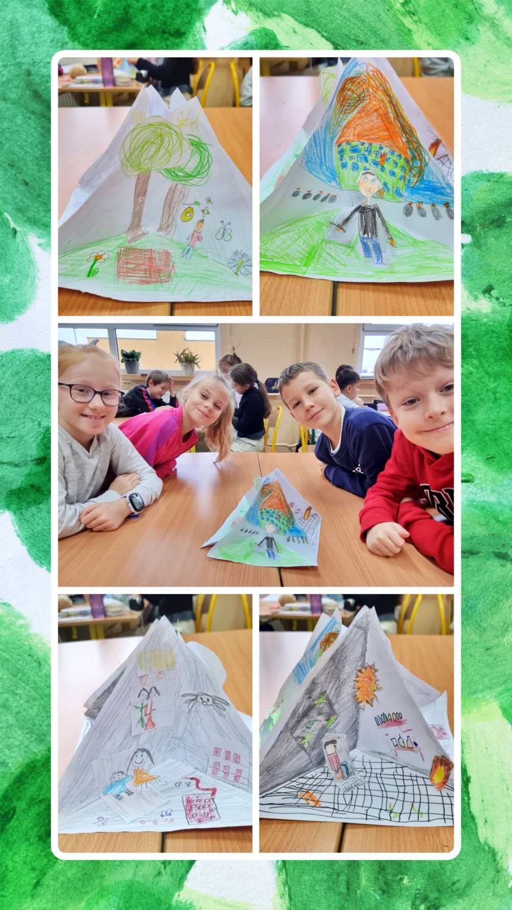 Metoda ta, zwana trioramą, jest przestrzenną formą plastyczną, przypominającą ostrosłup. Dzieci pracowały w grupach, wspólnie dokonały podziału, kto zajmuje się przedstawieniem wybranej sceny z życia Juliana Tuwima, a następnie tworzyły oryginalną pracę zbiorową. Aktywizująca triorama bardzo się dzieciom spodobała i dodatkowo pokazała, jak zgranym i sympatycznym zespołem jesteśmy.