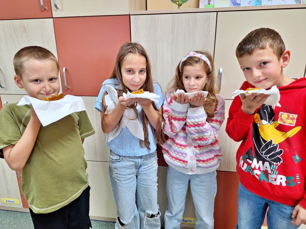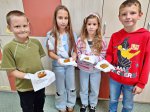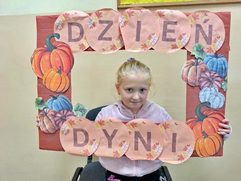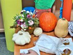 Przyniosła i pokazała różne odmiany dyni. Wykorzystała dynię do zrobienia pięknego bukietu, a na koniec poczęstowała nas pysznym ciastem dyniowym, które dzieci zjadły z radością do ostatniego okruszka. Uczniowie wzięli także udział w dyniowej sesji zdjęciowej.