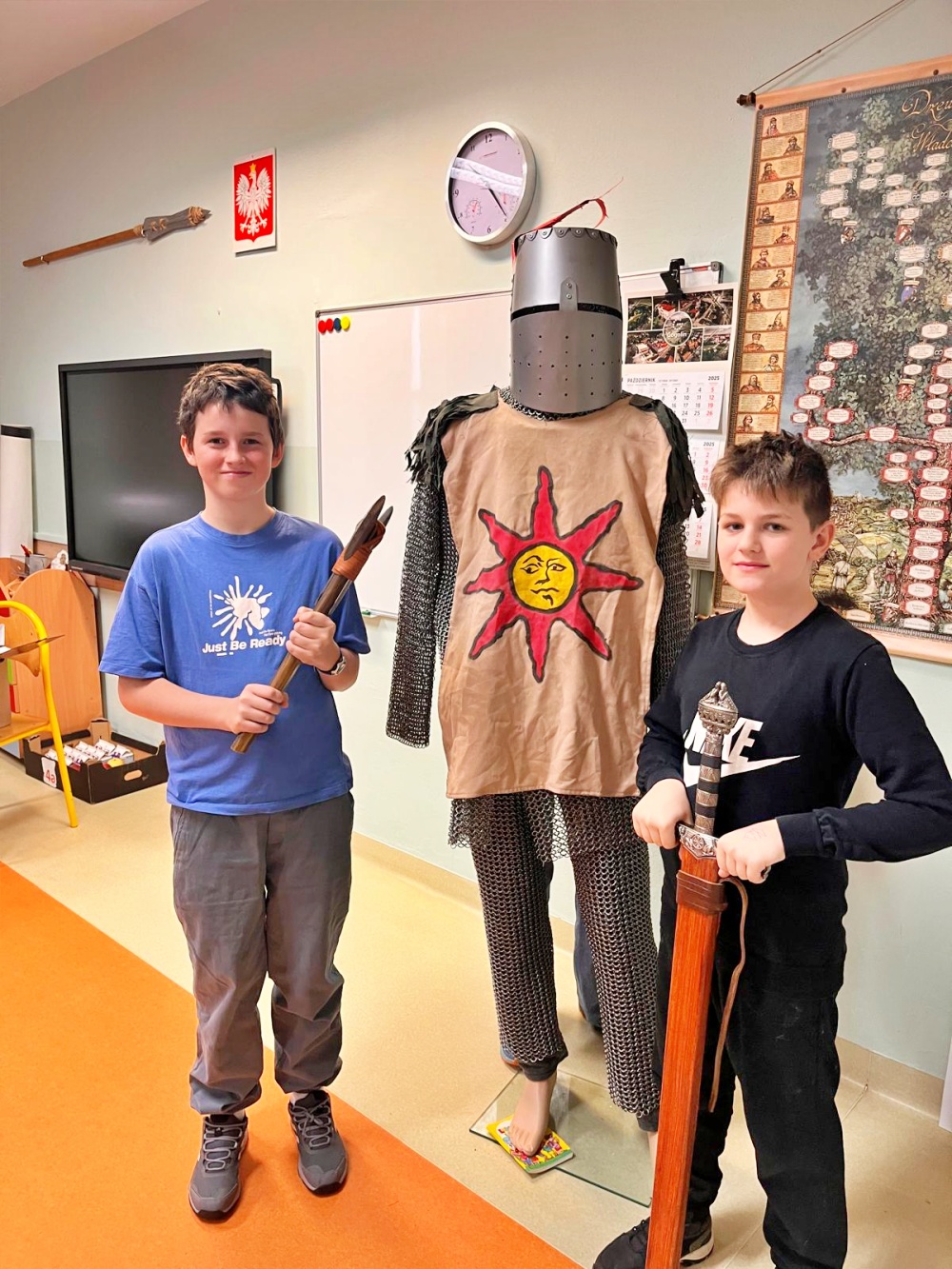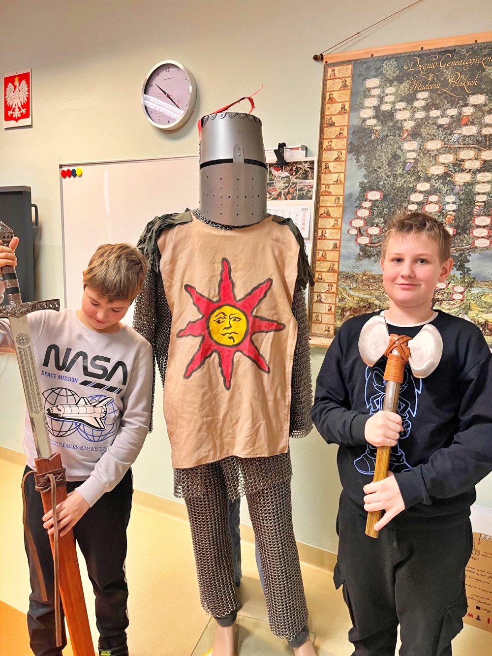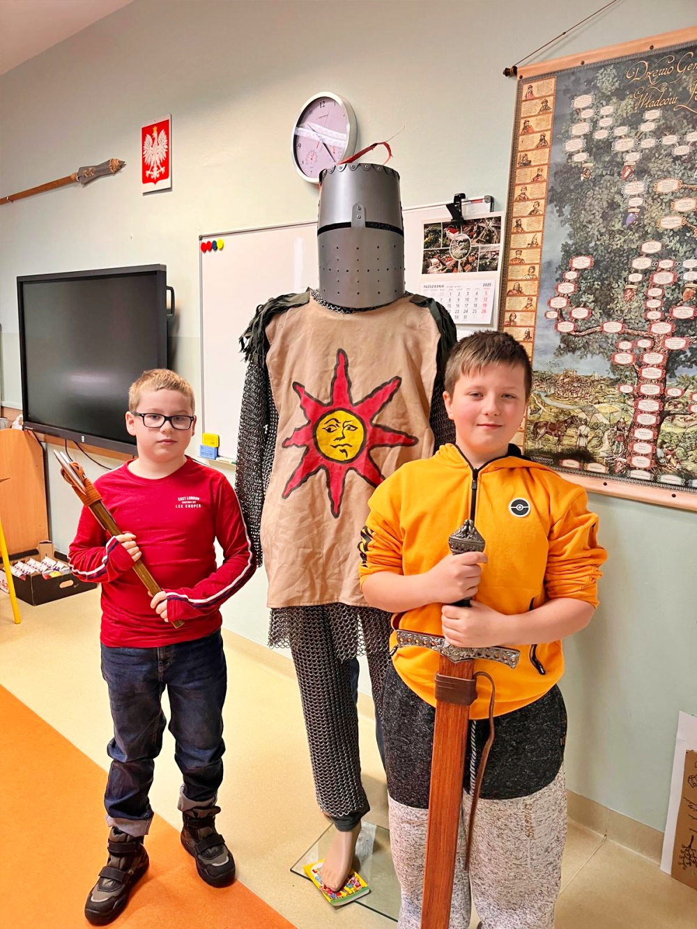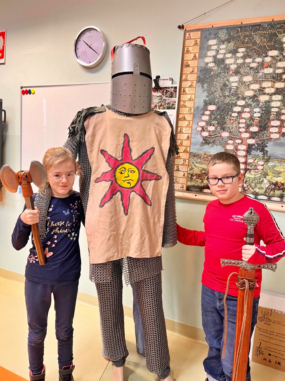 Kolejny, listopadowy etap innowacji - "Średniowieczne zamki i rycerze" przeniósł naszych uczestników w historyczne czasy początku XV wieku. Najpierw przeczytałam uczniom legendę pod tytułem "Grunwaldzkie miecze", opowiadającą o jednej z najsłynniejszych średniowiecznych bitew rozegranej na polach pod Grunwaldem. Słuchając, dzieci wykonały indywidualnie projekty rycerskich herbów. Wiele zainteresowania wzbudził manekin przebrany za rycerza, w odtworzonej z ogromną dbałością o detale zbroi, wyposażony w miecz i topór z epoki, który zawitał do naszej klasy. Każdy chciał mieć z nim zdjęcie! Na koniec dzieci uzupełniły luki w tekście nawiązującym do przeczytanej legendy, udowadniając, jak wiele informacji z niej zapamiętały.