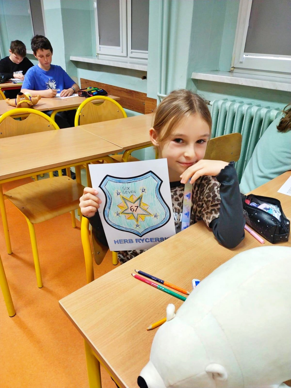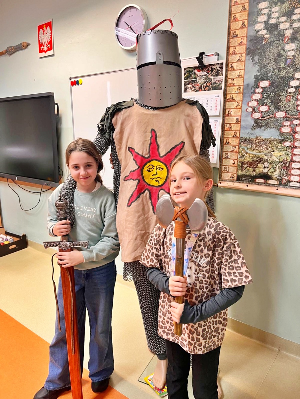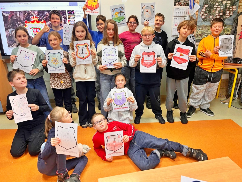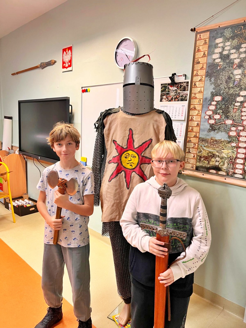 Kolejny, listopadowy etap innowacji - "Średniowieczne zamki i rycerze" przeniósł naszych uczestników w historyczne czasy początku XV wieku. Najpierw przeczytałam uczniom legendę pod tytułem "Grunwaldzkie miecze", opowiadającą o jednej z najsłynniejszych średniowiecznych bitew rozegranej na polach pod Grunwaldem. Słuchając, dzieci wykonały indywidualnie projekty rycerskich herbów. Wiele zainteresowania wzbudził manekin przebrany za rycerza, w odtworzonej z ogromną dbałością o detale zbroi, wyposażony w miecz i topór z epoki, który zawitał do naszej klasy. Każdy chciał mieć z nim zdjęcie! Na koniec dzieci uzupełniły luki w tekście nawiązującym do przeczytanej legendy, udowadniając, jak wiele informacji z niej zapamiętały.