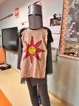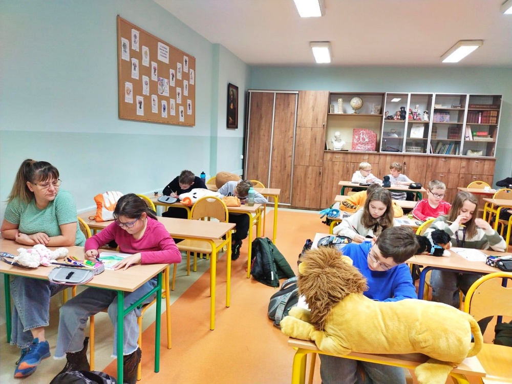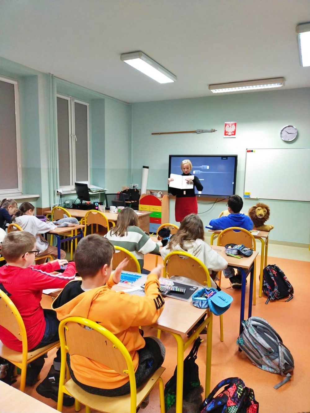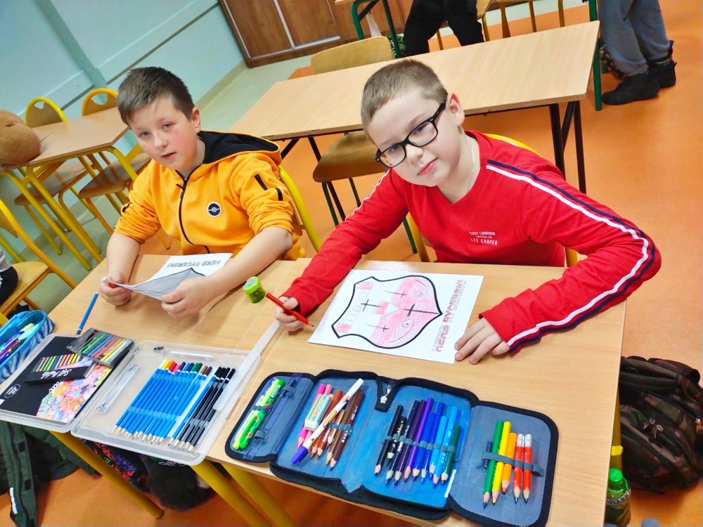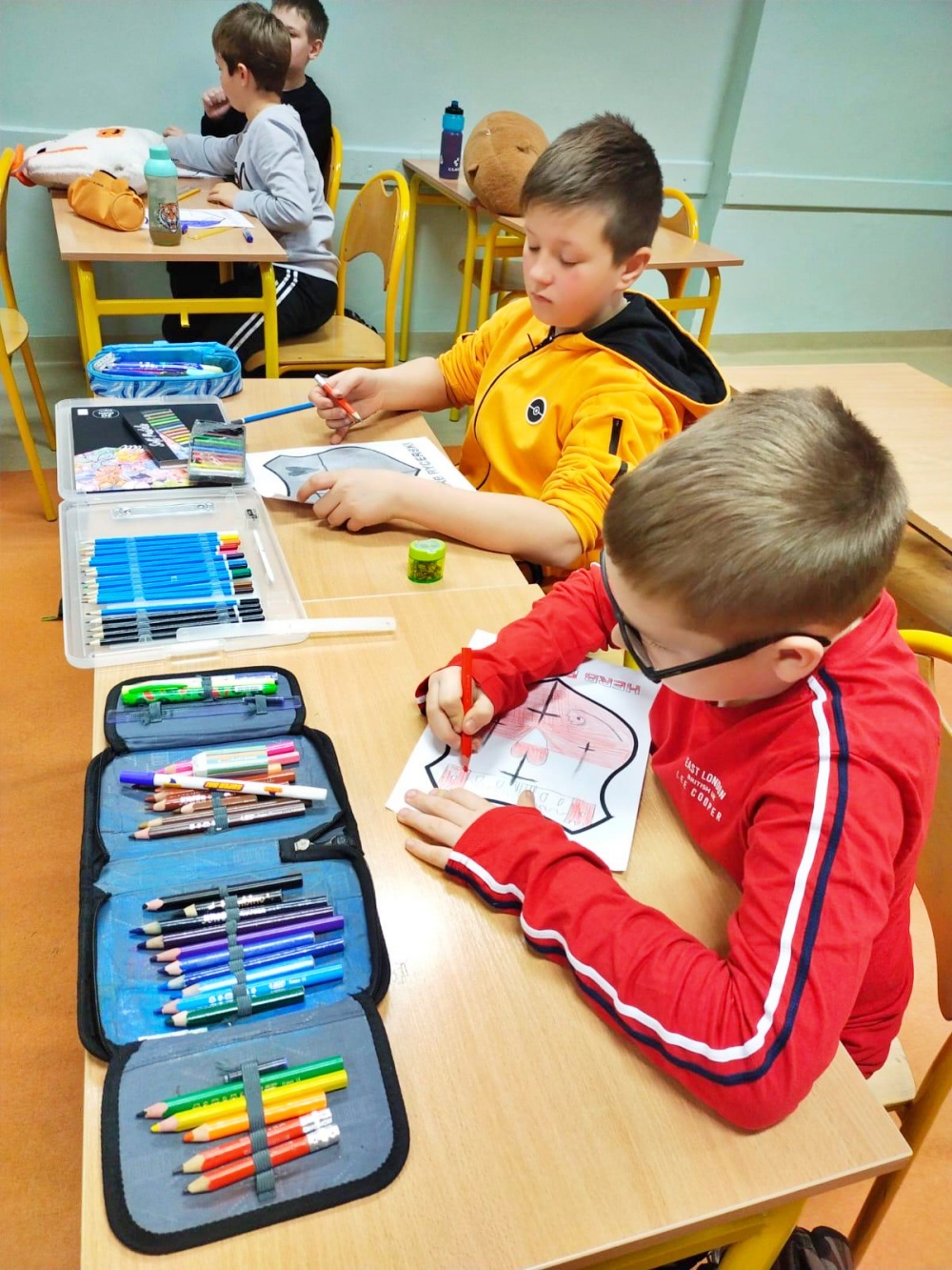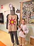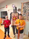Kolejny, listopadowy etap innowacji - "Średniowieczne zamki i rycerze" przeniósł naszych uczestników w historyczne czasy początku XV wieku. Najpierw przeczytałam uczniom legendę pod tytułem "Grunwaldzkie miecze", opowiadającą o jednej z najsłynniejszych średniowiecznych bitew rozegranej na polach pod Grunwaldem. Słuchając, dzieci wykonały indywidualnie projekty rycerskich herbów. Wiele zainteresowania wzbudził manekin przebrany za rycerza, w odtworzonej z ogromną dbałością o detale zbroi, wyposażony w miecz i topór z epoki, który zawitał do naszej klasy. Każdy chciał mieć z nim zdjęcie! Na koniec dzieci uzupełniły luki w tekście nawiązującym do przeczytanej legendy, udowadniając, jak wiele informacji z niej zapamiętały.